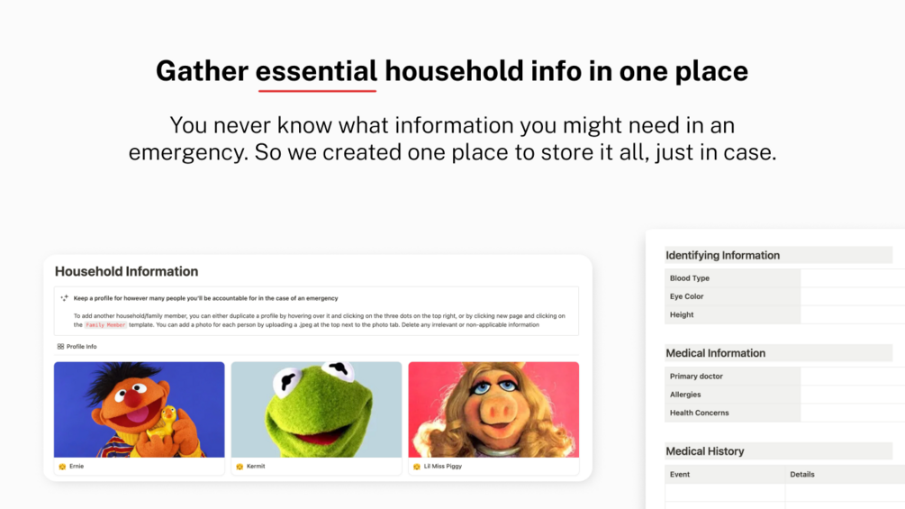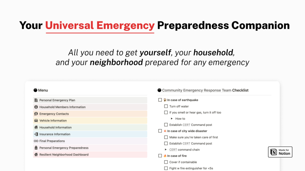 This is not your ordinary Notion template, nor is it really a template. In reality, it’s more of a Household Emergency Preparedness Companion integrated into Notion. The focus here is not on the design (though we love a minimalist aesthetic), but on the content. Above all else, this is a tool to help you build emergency resilience.