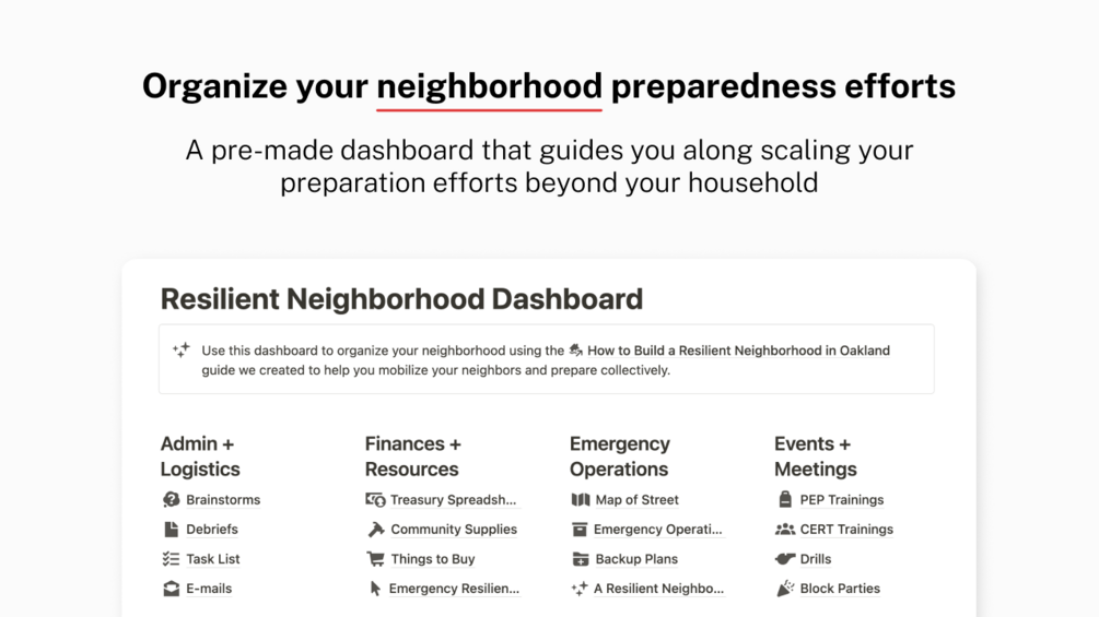 - A Neighborhood Dashboard template with pre-populated resources, community supplies lists, task lists, and sample e-mails to get your neighbors on board
