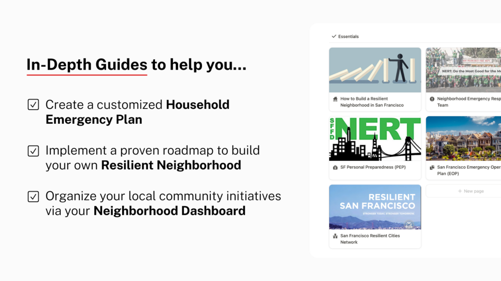 This is where The Resilient Peeps come in. By combining the best of emergency management with the best of tech, we created a user-friendly, all-in-one guide to get yourself, your household, and your neighborhood prepared for any emergency. It contains templates to organize and store all the most important info, but more than that, it is full of useful resources, local numbers and organizations, and emergency operation plans, as well as guides and checklists on how to create a personal emergency plan, how to implement a proven plan to build your own resilient neighborhood, and your own neighborhood dashboard. We have different city editions, and are always adding more.
